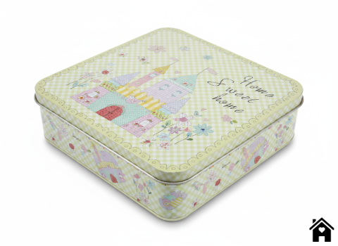 This delightful square tin box features a charming gingham pattern in light yellow and white, adorned with a whimsical castle illustration and floral designs. The text "Home sweet home" is elegantly integrated into the artwork, making it a perfect decorative piece for any home. Ideal for storage or as a gift, this tin box combines functionality with a touch of whimsy.