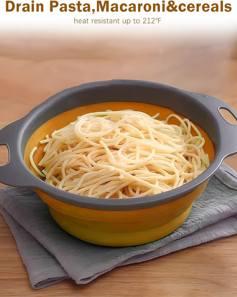 High Quality Material: This silicone collapsible colander with handle is made of high-quality silicone and pp, which is non-toxic, environmentally friendly, and can be used for a long time. It features heat resistance up to 450°F/230°C, durable non-slip silicone with contoured handles for comfort, so you can easily use it with hot foods