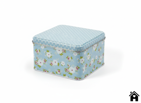 Add a touch of vintage charm and functionality to your home with this beautifully designed square tin box. The body features a delightful light blue floral pattern, while the lid is adorned with a soft polka dot design. Perfect for storing trinkets, baked goods, or sewing supplies, this tin combines practicality with decorative appeal.
